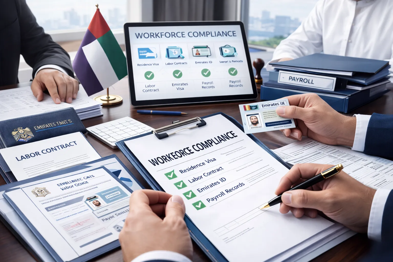 Visa processing, MOHRE file management, employment contracts, inspections, and workforce compliance.